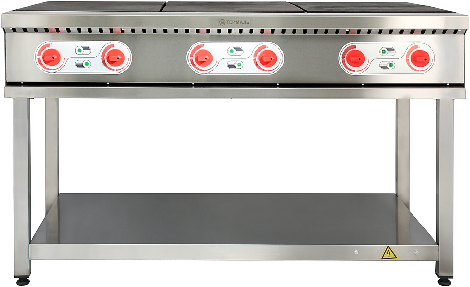 Плита электрическая Термаль ПЭ-6 предназначена для приготовления различного вида блюд на предприятиях общественного питания и торговли. Контактные части и коммутационные провода защищены от попадания жидкости, благодаря чему обспечивается устойчивость к влажности. Прямоугольные легкосъемные цельнолитые конфорки гарантируют равномерный нагрев, в них также залиты ТЭНы, что предохраняет их от контакта с воздухом и, как следствие этого, от окисления.