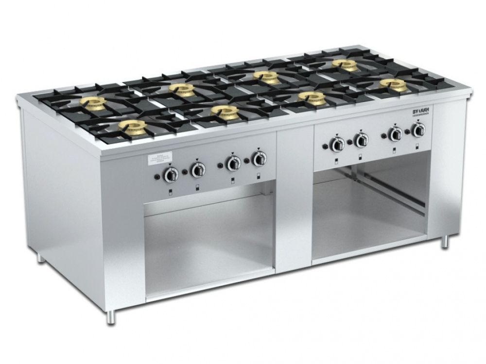 Газовая плита Вулкан ПРГ-IIA-8 Maxi предназначена для приготовления первых, вторых и третьих блюд в наплитной посуде на предприятиях общественного питания и торговли. Модель оснащена газ-контролем, пьезорозжигом и запальной горелкой. Корпус выполнен из нержавеющей стали, решетка - из чугуна, газовые горелки - из латуни.
