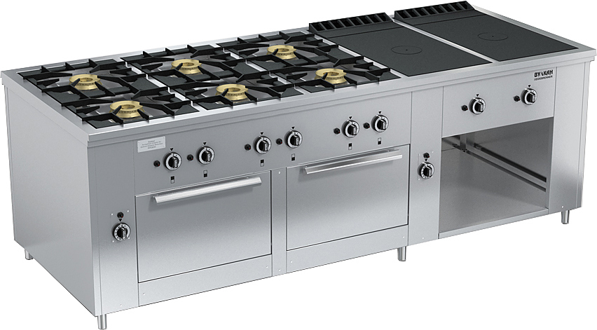 Газовая плита Вулкан ПРГ-IIA-10-2 2ДШ Maxi предназначена для приготовления первых, вторых и третьих блюд в наплитной посуде, выпечки хлебобулочных и кондитерских изделий на предприятиях общественного питания и торговли. Модель оснащена 6 секционными и 2 сплошными горелками, 2 духовыми шкафами, газ-контролем, пьезорозжигом и запальной горелкой. Корпус выполнен из нержавеющей стали.