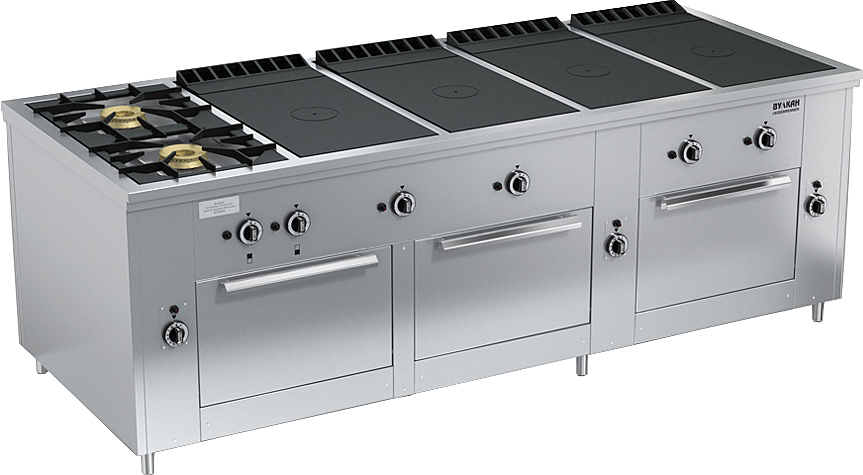 Газовая плита Вулкан ПРГ-IIA-10-4 3ДШ Maxi предназначена для приготовления первых, вторых и третьих блюд в наплитной посуде, выпечки хлебобулочных и кондитерских изделий на предприятиях общественного питания и торговли. Модель оснащена 2 секционными и 4 сплошными горелками, 3 духовыми шкафами, газ-контролем, пьезорозжигом и запальной горелкой. Корпус выполнен из нержавеющей стали.