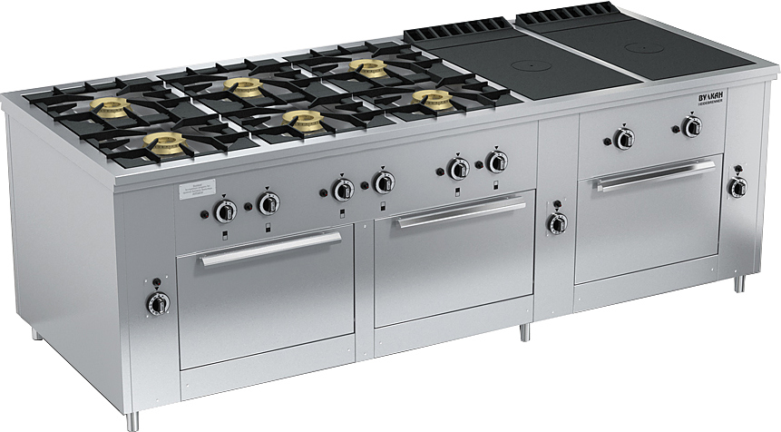 Газовая плита Вулкан ПРГ-IIA-10-2 3ДШ Maxi предназначена для приготовления первых, вторых и третьих блюд в наплитной посуде, выпечки хлебобулочных и кондитерских изделий на предприятиях общественного питания и торговли. Модель оснащена 6 секционными и 2 сплошными горелками, 3 духовыми шкафами, газ-контролем, пьезорозжигом и запальной горелкой. Корпус выполнен из нержавеющей стали.