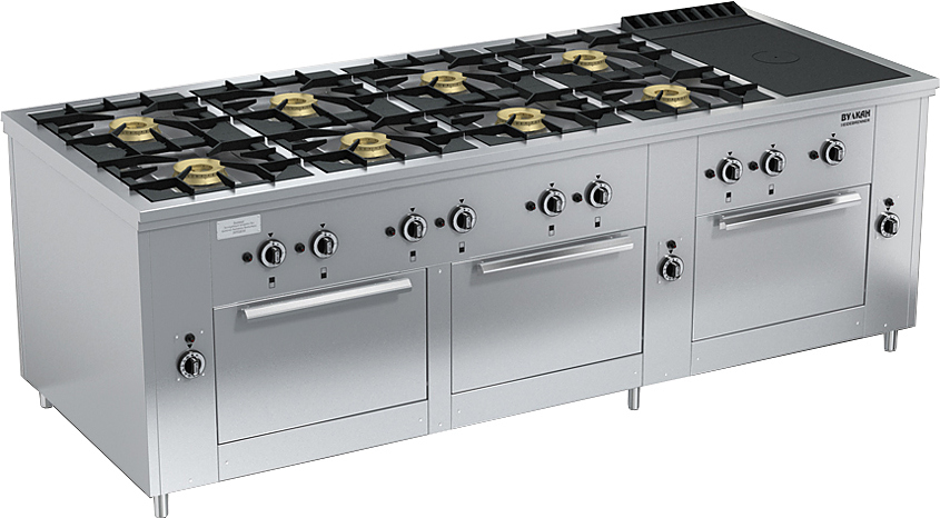 Газовая плита Вулкан ПРГ-IIA-10-1 3ДШ Maxi предназначена для приготовления первых, вторых и третьих блюд в наплитной посуде, выпечки хлебобулочных и кондитерских изделий на предприятиях общественного питания и торговли. Модель оснащена 8 секционными и 1 сплошной горелками, 3 духовыми шкафами, газ-контролем, пьезорозжигом и запальной горелкой. Корпус выполнен из нержавеющей стали.