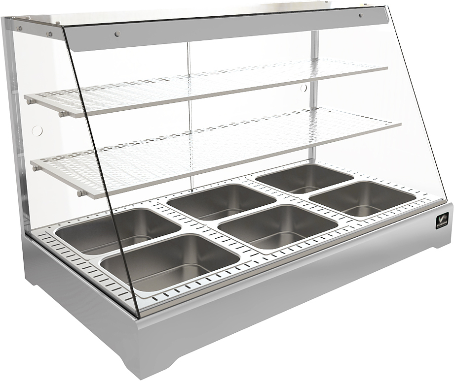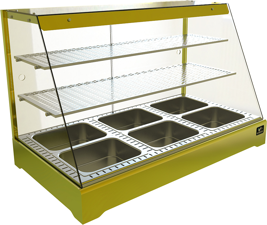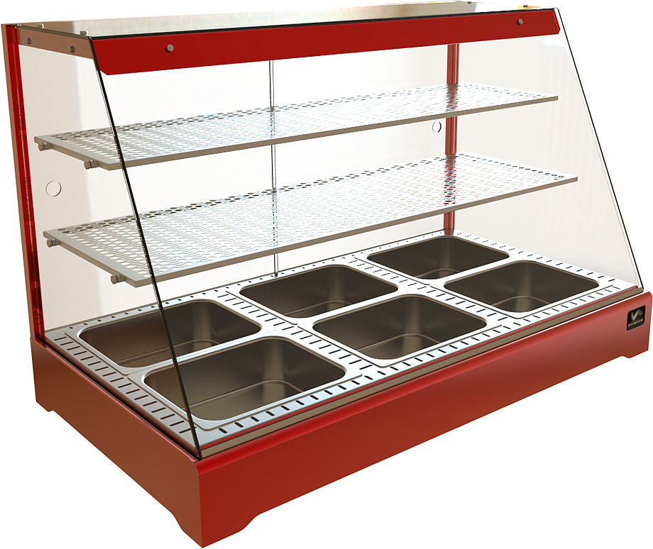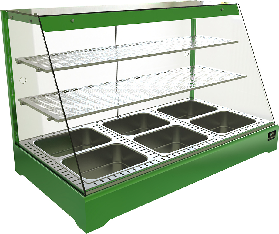 Тепловая витрина Кобор CR2-117H серии Standart предназначена для демонстрации, подогрева и поддержания в теплом состоянии различных блюд на предприятиях общественного питания и торговли. Модель оснащена перфорированными полками 1120х350 и 1120х280 мм и подсветкой.