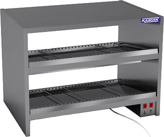 Тепловая витрина КАМИК ВТ-9060 используется на предприятиях общественного питания и торговли для подогрева, демонстрации и кратковременного хранения продуктов и готовых блюд в горячем состоянии. Подогрев размещенных внутри двухуровневой конструкции продуктов осуществляется посредством ТЭНов. Модель оснащена подсветкой в виде ламп накаливания. Корпус выполнен из нержавеющей стали AISI 430.