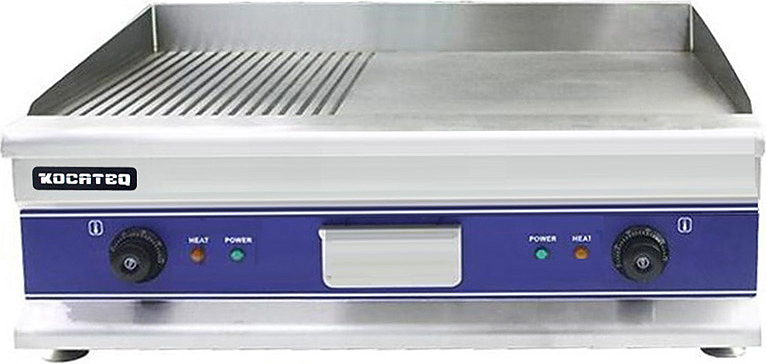 Гриль-сковорода Kocateq GH800 2 используется на предприятиях общественного питания, торговли и пищевых производствах для приготовления жареных мясных блюд, рыбных стейков, колбасок, сосисок, сарделек, шпикачек, котлет для бургеров, овощей, оладьев и других продуктов питания. Модель оснащена гладкой и рифленой рабочей зоной, термостатом с автоматическим отключением при его повреждении, световыми индикаторами, выдвижным лотком для сбора остатков пищи, масла и жира и ножками. Материал корпуса - высококачественная нержавеющая сталь AISI 201, материал жарочной поверхности - сталь, материал ножек - пластик.