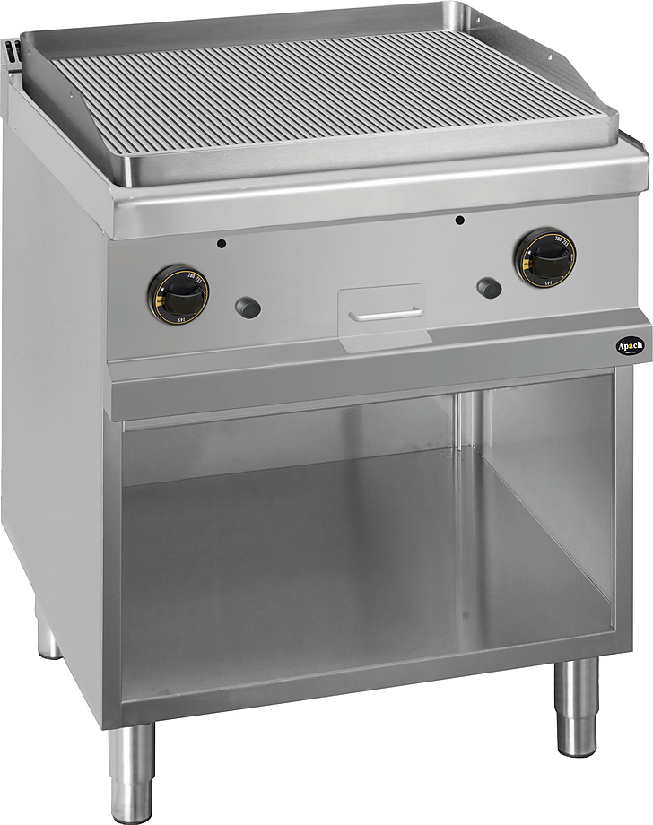 Открытая газовая сковорода Apach APTG-77PR700-й серии предназначена для обжарки мяса, рыбы и овощей на предприятиях общественного питания и торговли. Модель с закругленными краями и бортами оснащена электромеханической панелью управления с 2 терморегуляторами, горелками с пьезоэлектрическим поджигом и системой стабилизации пламени, выдвижным лотком для сбора остатков пищи, масла и жира и открытой подставкой с регулируемыми по высоте ножками.