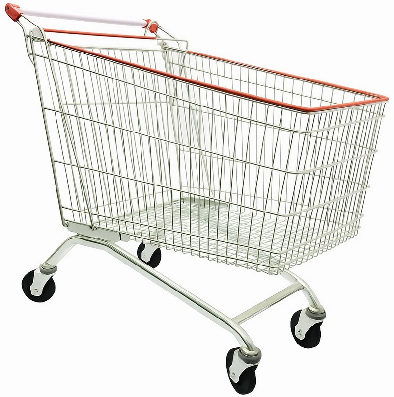 Покупательская тележка EKS используется в крупных гипермаркетах и магазинах самообслуживания для перевозки продуктов, текстиля, кухонной утвари, химии и др. Модель 4 поворотными колесами. Материал корпуса - сталь.