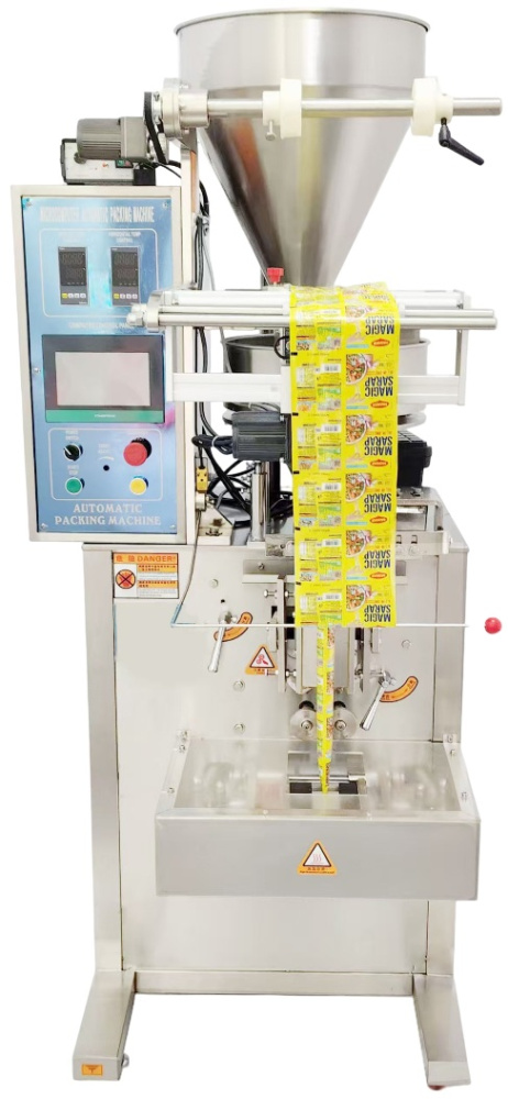используется на предприятиях общественного питания, торговли и пищевых производствах для дозирования и упаковки трудно-сыпучих продуктов и порошков в 4х шовный пакет. Модель оснащена PLC-контроллером, сенсорным интерфейсом, зубчатым ножом, насечкой для вскрытия упаковки, механическим датером и револьверным объемным дозатором. Материал изделия - высококачественная нержавеющая сталь AISI 340.