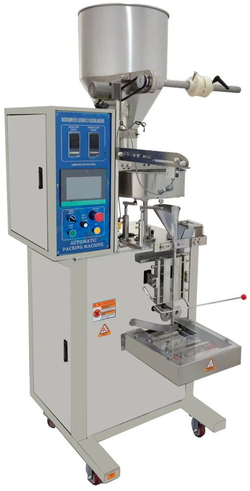 используется на предприятиях общественного питания, торговли и пищевых производствах для дозирования и упаковки трудно-сыпучих продуктов и порошков в 4х шовный пакет. Модель оснащена PLC-контроллером, сенсорным интерфейсом, зубчатым ножом, формирователь под пленку и револьверным объемным дозатором. Материал изделия - высококачественная нержавеющая сталь AISI 340.